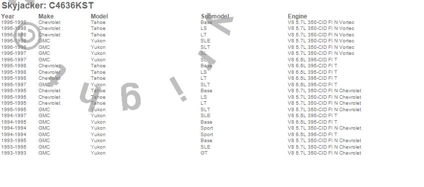 Below is an abbreviated list of applications for the Suspension Lift Kit.Blazer, Tahoe, Yukon, Chevrolet, GMC, 1999, 1998, 1997, 1996, 1995, 1994, 1993