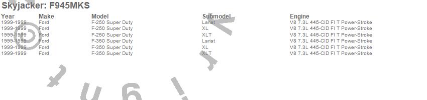 Brand: SkyjackerPart Number: F945MKSLift Kit; Rear Type: 4 in. Lift - Incl. Fr/Rr Leaf Springs - Track Bar Brkts - Fr/Rr UBolt Kits - Spring Bushing Kit - Sway Bar LinksUPC: 803696130071