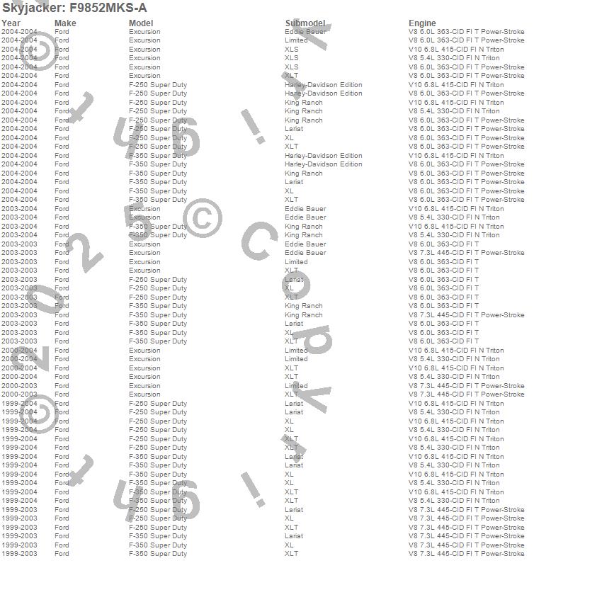 Brand: SkyjackerPart Number: F9852MKS-ALift Kit; Rear Type: 8 in. Lift - Incl Fr/Rr Leaf Springs - Track Bar Brkt - UBolt Kit - Spring Bushings - Sway Bar Link - Pitman Arm - Brake Line - Carrier BearingUPC: 803696130408
