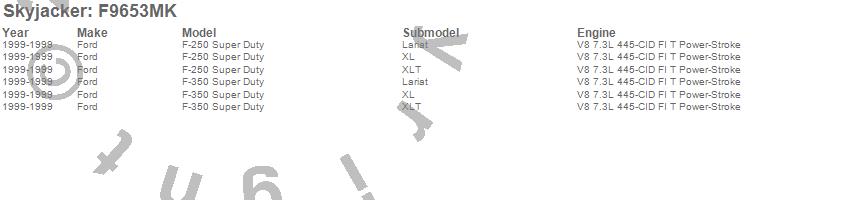 Brand: SkyjackerPart Number: F9653MKLift Kit; Rear Type: 6 in. Lift - Incl. Fr Leaf Springs - Track Bar Brkts - Front/Rear UBolt Kits - Spring Bushing Kit - Rear Block - Sway Bar LinksUPC: 803696130262
