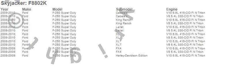 Below is an abbreviated list of applications for the Suspension Lift Kit.F-250 Super Duty Pickup, Ford, 2010, 2009, 2008