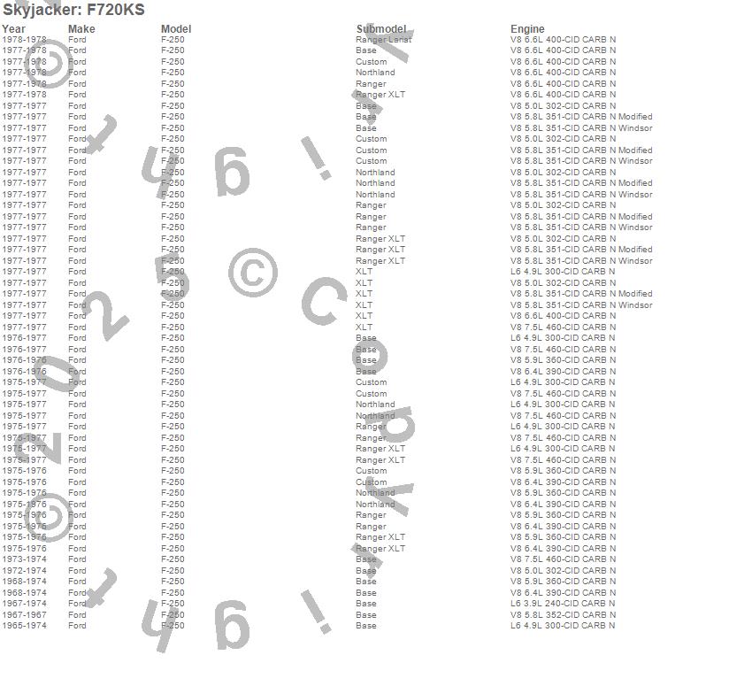 Below is an abbreviated list of applications for the Suspension Lift Kit.F-250 Pickup, Ford, 1977, 1976, 1975, 1974, 1973, 1972, 1971, 1970, 1969, 1968, 1967, 1966, 1965