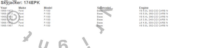 Brand: SkyjackerPart Number: 174EPKLift Kit; Rear Type: 4 in. Lift - Incl. Front Coil Springs - Rear Add-A-LeafsUPC: 803696103648