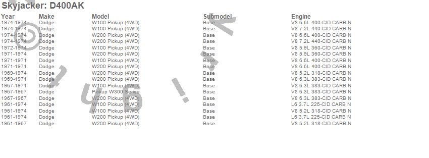 Below is an abbreviated list of applications for the Suspension Lift Kit.W100 Pickup, W100 Series, W200 Pickup, W200 Series, W300 Series, Dodge, 1974, 1973, 1972, 1971, 1970, 1969, 1968, 1967, 1966, 1965, 1964, 1963, 1962, 1961