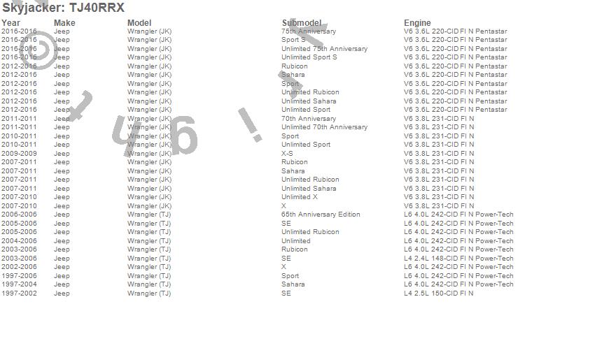 Brand: SkyjackerPart Number: TJ40RRXLift Kit-Suspension Component Type: 4 in. Lift - Incl. Frame Brackets - Rear Track Bar Bracket - Transfer Case Shifter - Rear Shock Relocation Bracket - Brakeline SetUPC: 803696199283