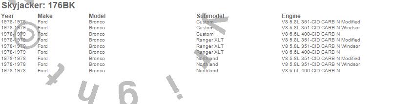 Brand: SkyjackerPart Number: 176BKLift Kit; Rear Type: 6 in. Lift - Incl. Front Coil Springs - Rear UBolt Kit - Rear BlocksUPC: 803696103747