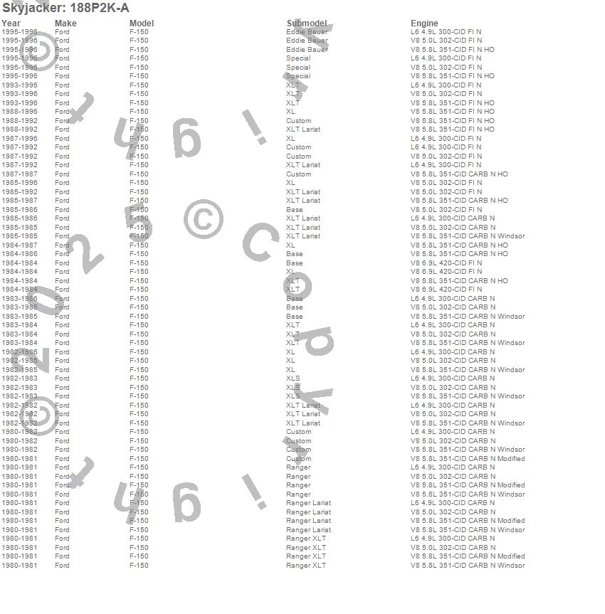 Below is an abbreviated list of applications for the Suspension Lift Kit.F-150 Pickup, Ford, 1996, 1995, 1994, 1993, 1992, 1991, 1990, 1989, 1988, 1987, 1986, 1985, 1984, 1983, 1982, 1981, 1980