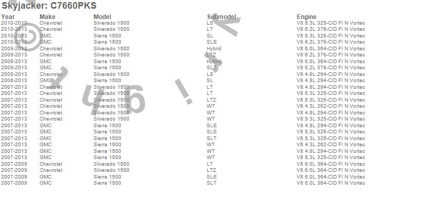 Brand: SkyjackerPart Number: C7660PKSLift Kit; Rear Type: 6 in. Lift - Incl. Component Box PN[C7660SP/C7661A/C7661PRS/CR55S] - Front Struts - Rear SpringsUPC: 803696199375
