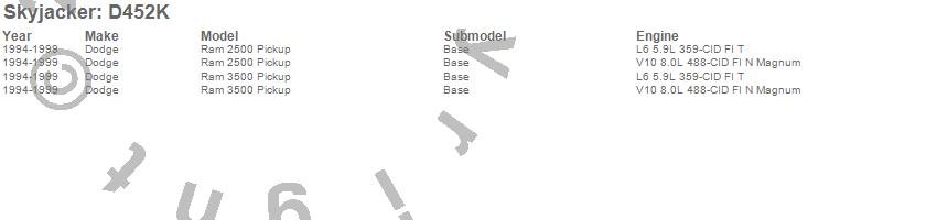 Brand: SkyjackerPart Number: D452KLift Kit; Rear Type: 4-4.5 in. Lift - Incl. Fr Coil Spring - Rr Leaf Spring - Links - Pitman Arm - Add-A-Leafs - UBolts - Skid Plate - Vent Hose - Steering Stab.UPC: 803696125381