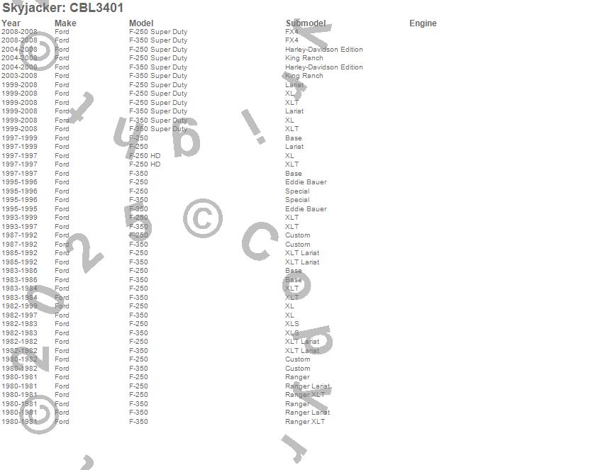 Below is an abbreviated list of applications for the Carrier Bearing Lowering Kit.F-250 Pickup, F-250 Super Duty Pickup, F-350 Pickup, F-350 Super Duty Pickup, Ford, 2008, 2007, 2006, 2005, 2004, 2003, 2002, 2001, 2000, 1999, 1998, 1997, 1996, 1995, 1994