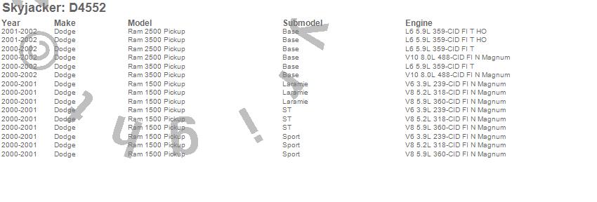 Brand: SkyjackerPart Number: D4552Lift Kit-Suspension Component Type: 4-5 in. Lift - Incl. Upper/Lower Links - Sway Bar Lowering Brkt - Bump StopsUPC: 803696125633