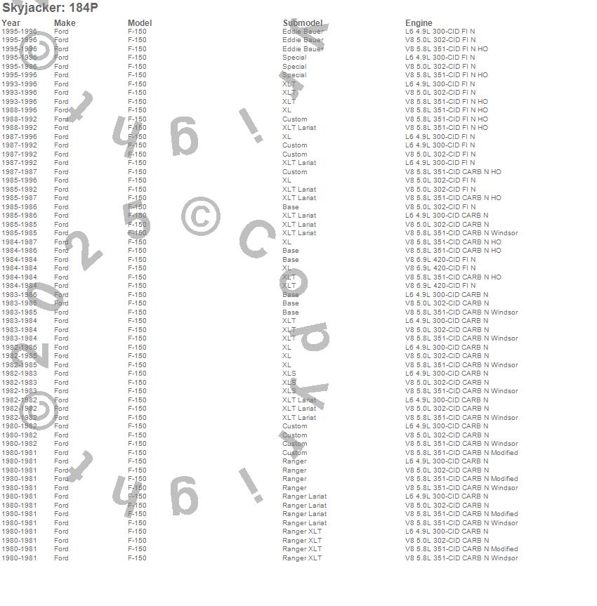 Below is an abbreviated list of applications for the Component Box For PN[184PK].F-150 Pickup, Ford, 1996, 1995, 1994, 1993, 1992, 1991, 1990, 1989, 1988, 1987, 1986, 1985, 1984, 1983, 1982, 1981, 1980