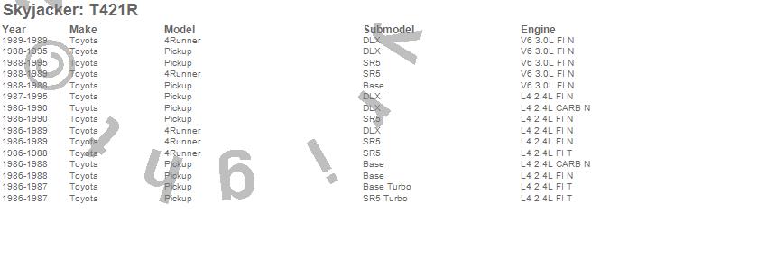 Brand: SkyjackerPart Number: T421RLift Kit-Suspension Component Type: 4 in. Lift - Incl. Rear UBolt Kit - Rear BlockUPC: 803696162232