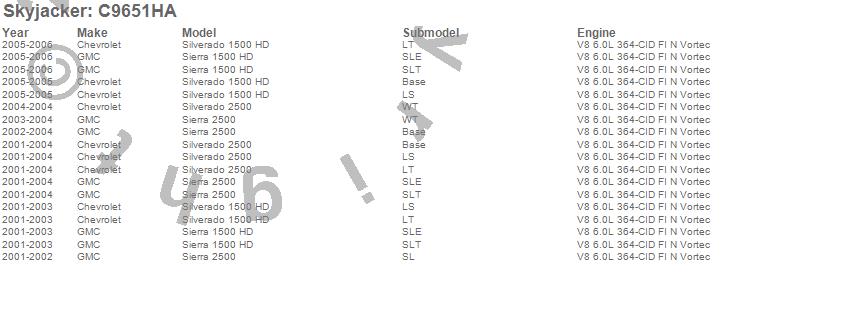 Below is an abbreviated list of applications for the Component Box For PN[C9651HK/C9651HKS].Sierra 1500 HD, Sierra 2500, Silverado 1500 HD, Silverado 2500, Chevrolet, GMC, 2006, 2005, 2004, 2003, 2002, 2001
