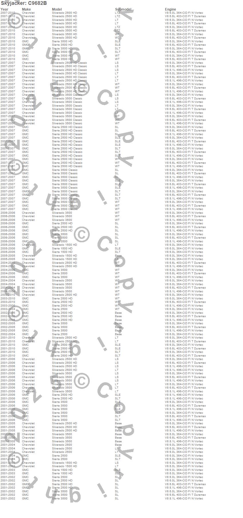 Below is an abbreviated list of applications for the Component Box For PN[C9651HK].Sierra 1500 HD, Sierra 2500, Sierra 2500 HD, Sierra 2500 HD Classic, Sierra 3500, Sierra 3500 Classic, Silverado 1500 HD, Silverado 2500, Silverado 2500 HD, Silverado 2500 HD Classic, Silverado 3500, Silverado 3500 Classic, Chevrolet, GMC, 2010, 2009, 2008, 2007, 2006, 2005