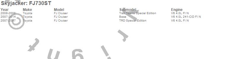 Brand: SkyjackerPart Number: FJ730STLift Kit-Suspension Component Type: 3 in. Lift - Performance StrutUPC: 803696189376