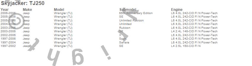 Brand: SkyjackerPart Number: TJ250Lift Kit-Suspension Component Type: 2.5 in. LiftUPC: 803696196985