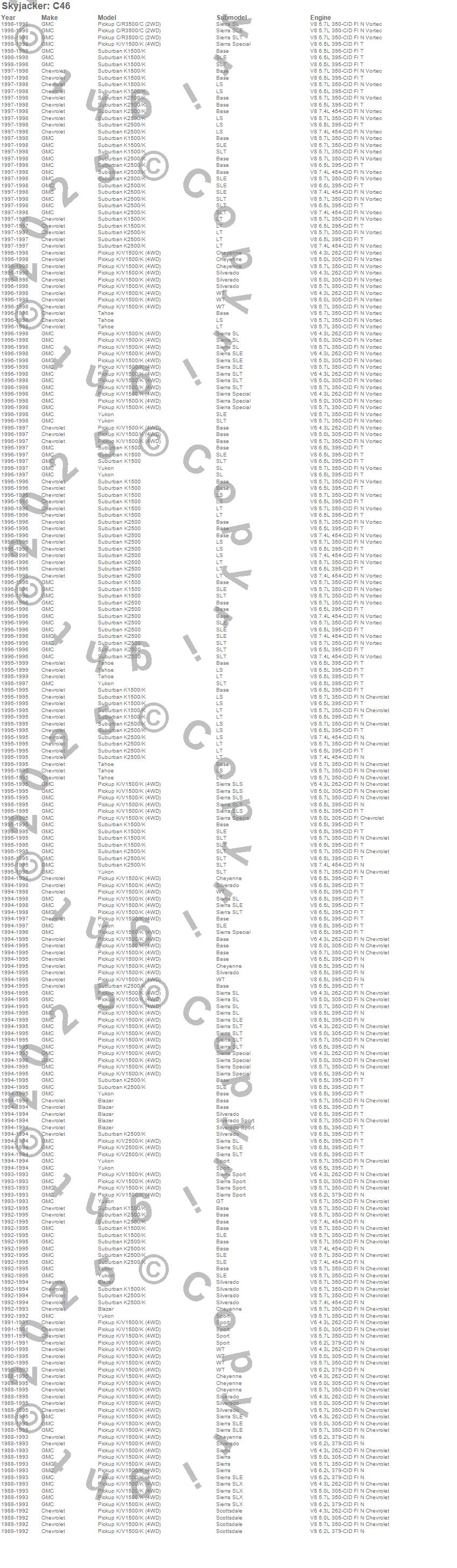 Below is an abbreviated list of applications for the Component Box For PN[C4636K/C4636KST].Blazer, C3500 Pickup, K1500 Pickup, K1500 Suburban, K2500 Suburban, Tahoe, Yukon, Chevrolet, GMC, 1999, 1998, 1997, 1996, 1995, 1994, 1993, 1992, 1991, 1990, 1989