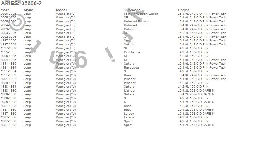 Below is an abbreviated list of applications for the 3 in. Round Side Bars.Wrangler (TJ), Wrangler (YJ), Jeep, 2006, 2005, 2004, 2003, 2002, 2001, 2000, 1999, 1998, 1997, 1995, 1994, 1993, 1992, 1991, 1990, 1989