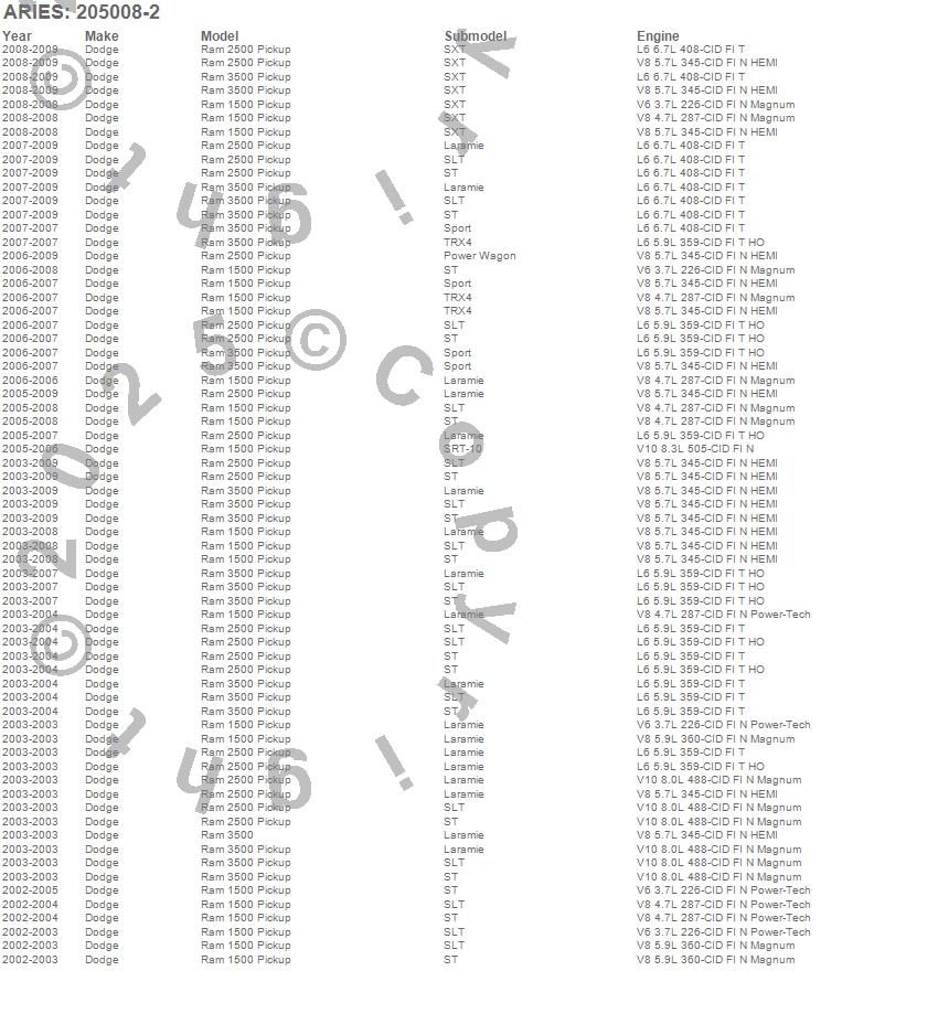 Below is an abbreviated list of applications for the 3 in. Round Side Bars.Ram 1500, Ram 2500, Ram 3500, Dodge, 2009, 2008, 2007, 2006, 2005, 2004, 2003, 2002