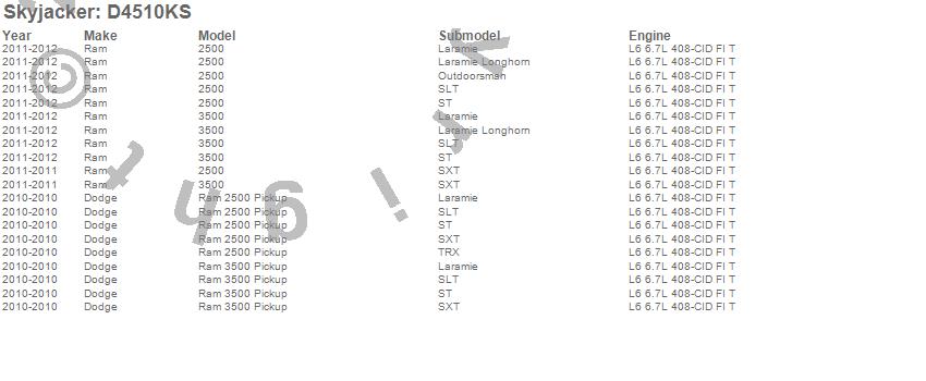 Below is an abbreviated list of applications for the Suspension Lift Kit.2500, 3500, Ram 2500 Pickup, Ram 3500 Pickup, Dodge, Ram, 2012, 2011, 2010