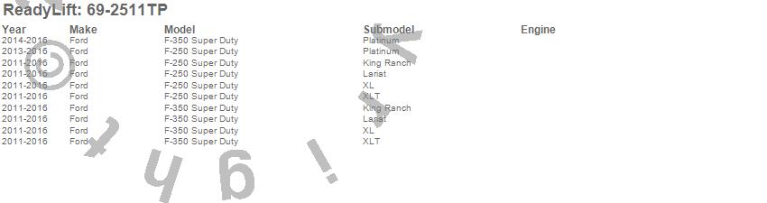 Below is an abbreviated list of applications for the SST Lift Kit.F-250 Super Duty, F-350 Super Duty, Ford, 2016, 2015, 2014, 2013, 2012, 2011