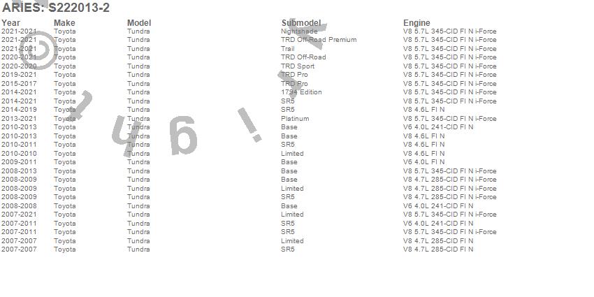 Below is an abbreviated list of applications for the The Standard 4 in. Oval Nerf Bar.Tundra, Toyota, 2021, 2020, 2019, 2018, 2017, 2016, 2015, 2014, 2013, 2012, 2011, 2010, 2009, 2008, 2007