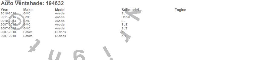 Below is an abbreviated list of applications for the Ventvisor In-Channel Deflector 4 pc..Acadia, Outlook, GMC, Saturn, 2016, 2015, 2014, 2013, 2012, 2011, 2010, 2009, 2008, 2007