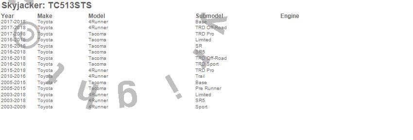 Brand: SkyjackerPart Number: TC513STSSuspension Strut Assembly Kit Type: Front - 1-3 in. - EachUPC: 803696206714