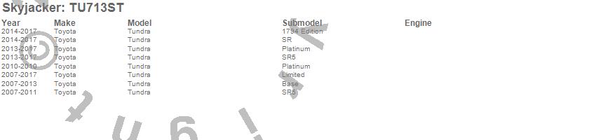 Brand: SkyjackerPart Number: TU713STSuspension Front Leveling Kit Type: 1 - 3 in. Lift - Incl. StrutUPC: 803696206783