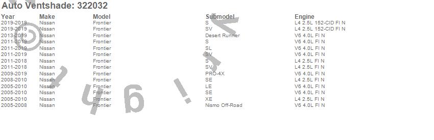 Below is an abbreviated list of applications for the Aeroskin Smoke Hood Protector.Frontier, Nissan, 2019, 2018, 2017, 2016, 2015, 2014, 2013, 2012, 2011, 2010, 2009, 2008, 2007, 2006, 2005