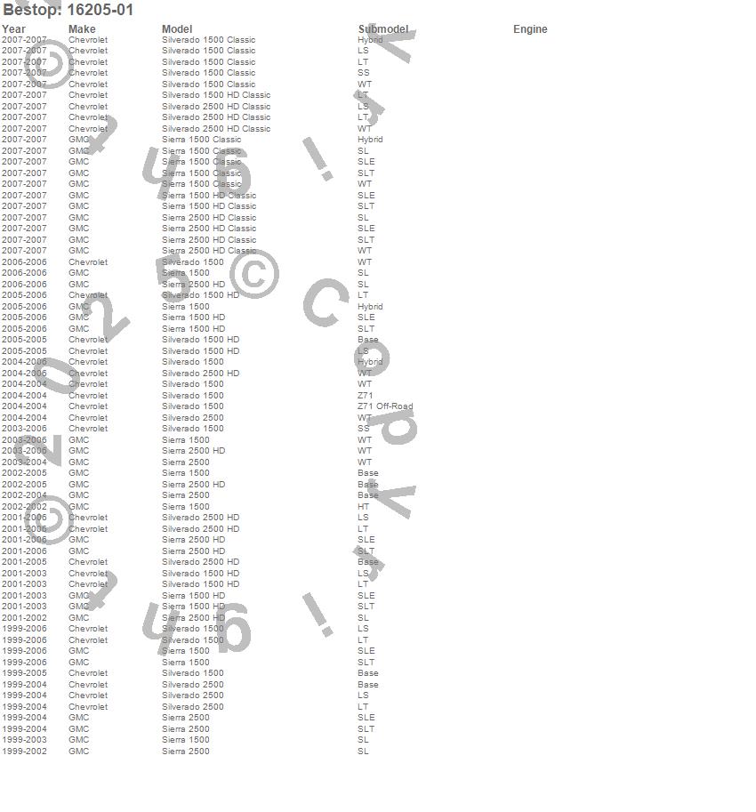 Below is an abbreviated list of applications for the EZ Fold Soft Tri-Fold Tonneau Cover.Sierra 1500, Sierra 1500 Classic, Sierra 1500 HD, Sierra 1500 HD Classic, Sierra 2500, Sierra 2500 HD, Sierra 2500 HD Classic, Silverado 1500, Silverado 1500 Classic, Silverado 1500 HD, Silverado 1500 HD Classic, Silverado 2500, Silverado 2500 HD, Silverado 2500 HD Classic, Chevrolet, GMC, 2007, 2006, 2005, 2004