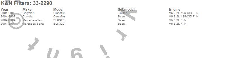 Below is an abbreviated list of applications for the Air Filter.Crossfire, Chrysler, 2008, 2007, 2006, 2005, 2004