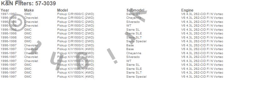 Below is an abbreviated list of applications for the Filtercharger Injection Performance Kit.C1500 Pickup, K1500 Pickup, Chevrolet, GMC, 1998, 1997, 1996