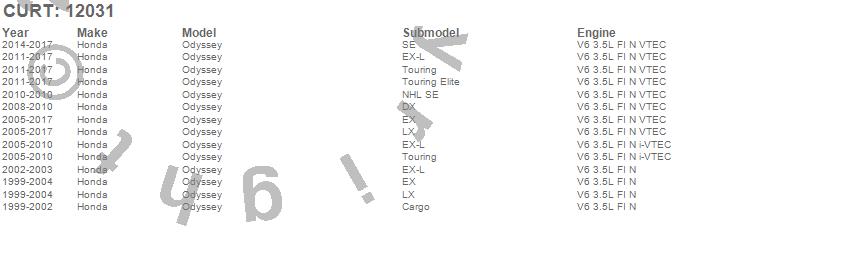 Below is an abbreviated list of applications for the Class II 1.25 in. Receiver Hitch.Odyssey, Honda, 2017, 2016, 2015, 2014, 2013, 2012, 2011, 2010, 2009, 2008, 2007, 2006, 2005, 2004, 2003, 2002, 2001, 2000