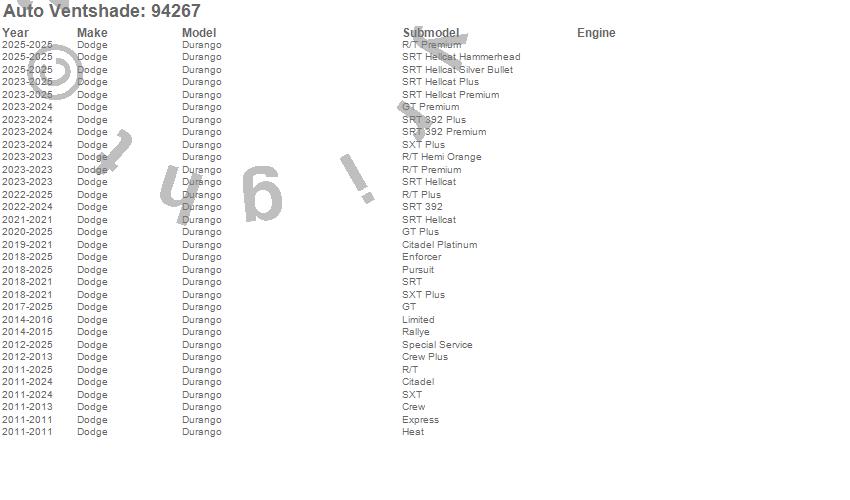 Below is an abbreviated list of applications for the Ventvisor Deflector 4 pc..Durango, Dodge, 2026, 2025, 2024, 2023, 2022, 2021, 2020, 2019, 2018, 2017, 2016, 2015, 2014, 2013, 2012, 2011