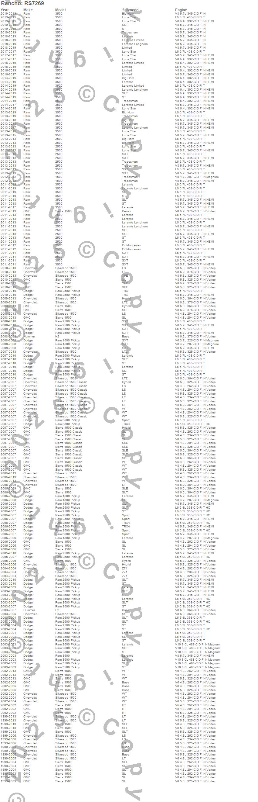 Below is an abbreviated list of applications for the RS7000MT Monotube Shock.2500, 2500 (Canadian), 3500, 3500 (Canadian), H2, RAM 1500 PICKUP, RAM 2500 PICKUP, RAM 3500 PICKUP, SIERRA 1500, SIERRA 1500 CLASSIC, SILVERADO 1500, SILVERADO 1500 CLASSIC, CHEVROLET, DODGE, GMC, HUMMER, RAM, 2013, 2012, 2011