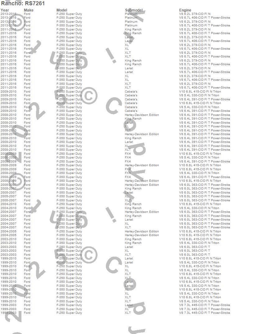 Below is an abbreviated list of applications for the RS7000MT Monotube Shock.F-250 SUPER DUTY PICKUP, F-250 SUPER DUTY PICKUP (Canadian), F-350 SUPER DUTY PICKUP, F-350 SUPER DUTY PICKUP (Canadian), FORD, 2013, 2012, 2011, 2010, 2009, 2008, 2007, 2006, 2005, 2004, 2003, 2002, 2001, 2000, 1999