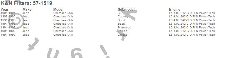 Below is an abbreviated list of applications for the Filtercharger Injection Performance Kit.Cherokee, Jeep, 1995, 1994, 1993, 1992, 1991
