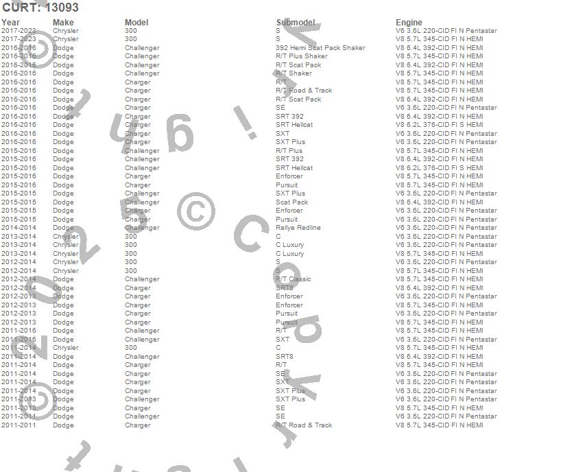 Below is an abbreviated list of applications for the Class III 2 in. Receiver Hitch.300, Challenger, Charger, Chrysler, Dodge, 2023, 2022, 2021, 2020, 2019, 2018, 2017, 2016, 2015, 2014, 2013, 2012, 2011