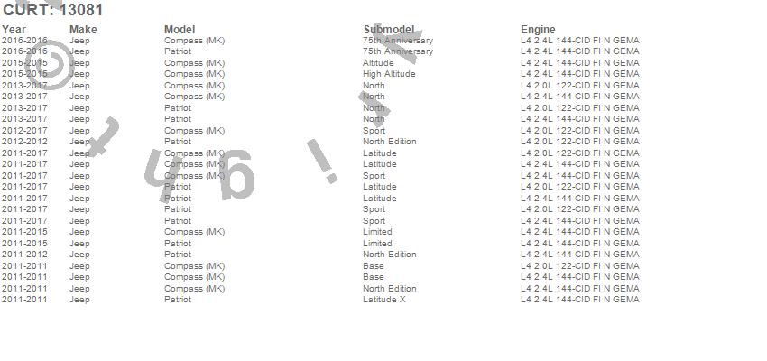 Below is an abbreviated list of applications for the Class III 2 in. Receiver Hitch.Compass, Patriot, Jeep, 2017, 2016, 2015, 2014, 2013, 2012, 2011