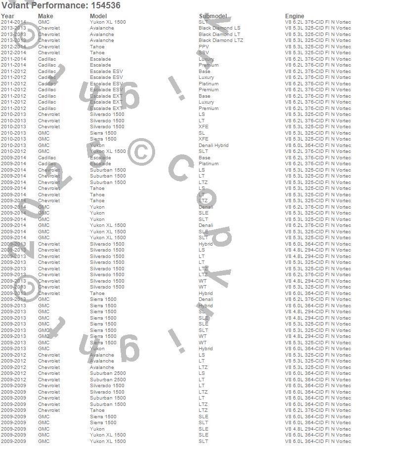 Below is an abbreviated list of applications for the Cold Air Intake Kit.Avalanche, Escalade, Escalade ESV, Escalade EXT, Sierra 1500, Silverado 1500, Suburban 1500, Suburban 2500, Tahoe, Yukon, Yukon XL 1500, Cadillac, Chevrolet, GMC, 2014, 2013, 2012, 2011, 2010, 2009