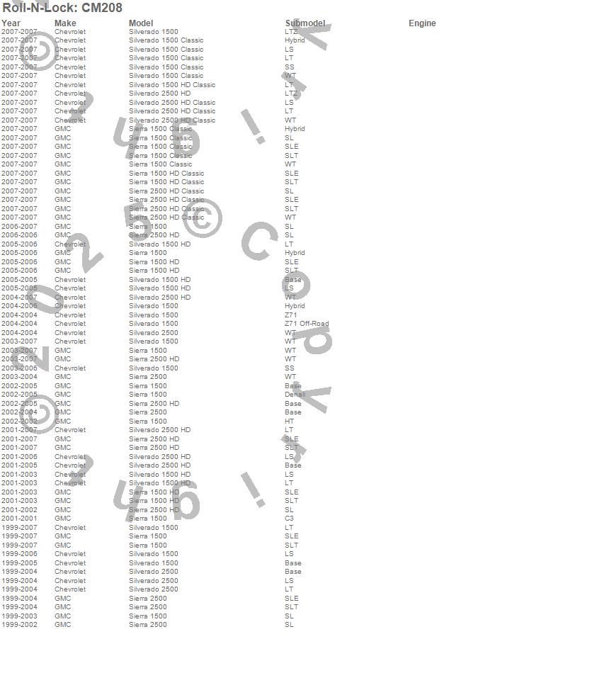 Below is an abbreviated list of applications for the Cargo Manager Rolling Truck Bed Divider.Sierra 1500, Sierra 1500 Classic, Sierra 1500 HD, Sierra 1500 HD Classic, Sierra 2500, Sierra 2500 HD, Sierra 2500 HD Classic, Silverado 1500, Silverado 1500 Classic, Silverado 1500 HD, Silverado 1500 HD Classic, Silverado 2500, Silverado 2500 HD, Silverado 2500 HD Classic, Chevrolet, GMC, 2007, 2006, 2005, 2004