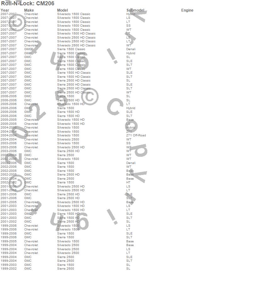 Below is an abbreviated list of applications for the Cargo Manager Rolling Truck Bed Divider.Sierra 1500, Sierra 1500 Classic, Sierra 1500 HD, Sierra 1500 HD Classic, Sierra 2500, Sierra 2500 HD, Sierra 2500 HD Classic, Silverado 1500, Silverado 1500 Classic, Silverado 1500 HD, Silverado 1500 HD Classic, Silverado 2500, Silverado 2500 HD, Silverado 2500 HD Classic, Chevrolet, GMC, 2007, 2006, 2005, 2004