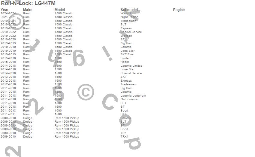 Below is an abbreviated list of applications for the Roll-N-Lock M-Series Truck Bed Cover.1500, 1500 Classic, Ram 1500, Dodge, Ram, 2024, 2023, 2022, 2021, 2020, 2019, 2018, 2017, 2016, 2015, 2014, 2013, 2012, 2011, 2010