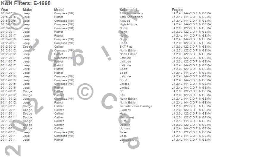Below is an abbreviated list of applications for the Air Filter.Caliber, Compass, Patriot, Dodge, Jeep, 2017, 2016, 2015, 2014, 2013, 2012, 2011