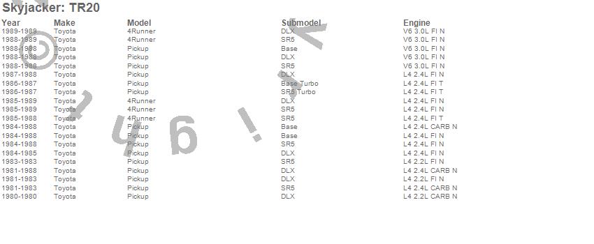 Below is an abbreviated list of applications for the Softride Leaf Spring.4Runner, Pickup, Toyota, 1989, 1988, 1987, 1986, 1985, 1984, 1983, 1982, 1981, 1980