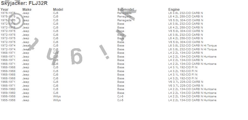 Below is an abbreviated list of applications for the Fitted Leaf.CJ5, CJ6, Jeep, 1975, 1974, 1973, 1972, 1971, 1970, 1969, 1968, 1967, 1966, 1960, 1959, 1958, 1957, 1956, 1955