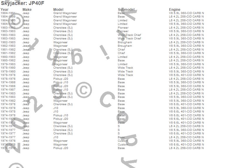 Below is an abbreviated list of applications for the Softride Leaf Spring.Cherokee, Grand Wagoneer, J10, J20, Wagoneer, Jeep, 1991, 1990, 1989, 1988, 1987, 1986, 1985, 1984, 1983, 1982, 1981, 1980, 1979, 1978