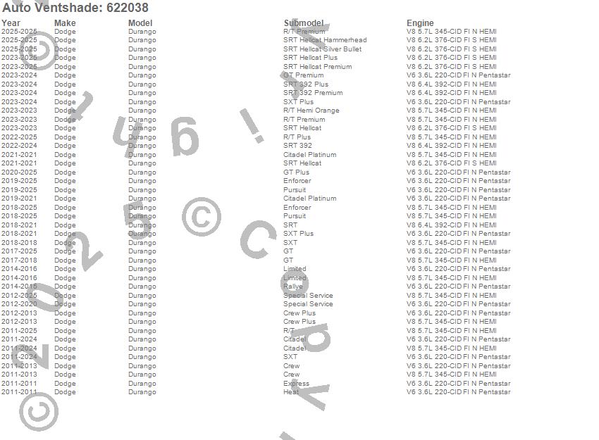 Below is an abbreviated list of applications for the Aeroskin Chrome Hood Protector.Durango, Dodge, 2025, 2024, 2023, 2022, 2021, 2020, 2019, 2018, 2017, 2016, 2015, 2014, 2013, 2012, 2011